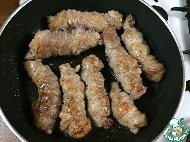 Обжариваем трубочки на постном масле до золотистой корочки, накрываем крышкой и тушим на медленном огне в жидкости, которую выделили трубочки примерно 20-25 мин.