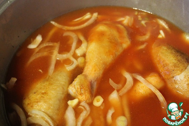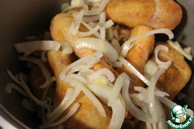 Сверху положить обжаренные голени, лук нарезанный полукольцами и чеснок нарезанный пластинками.