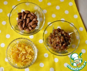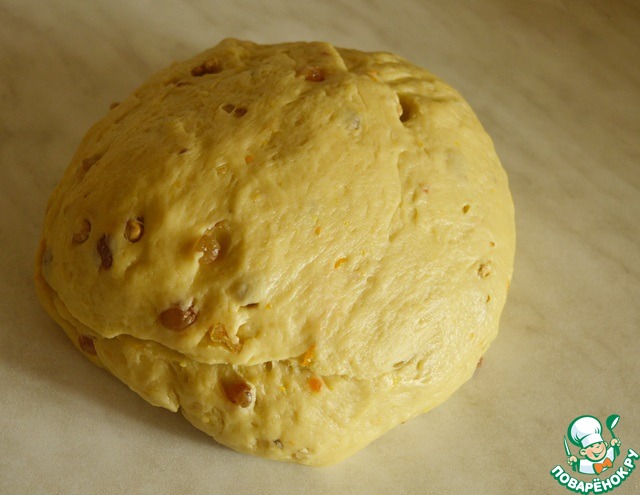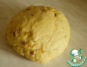 Добавляем набухший и высушенный бумажным полотенцем изюм, цукаты и орехи (я очень люблю в дрожжевой выпечке миндаль, но Вы можете использовать свои любимые орехи).