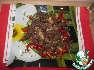 Сначала подготовим говядину. Это можно сделать заранее, и она хорошо замаринуется. Итак, говядину нарезаем тонкими полосками.