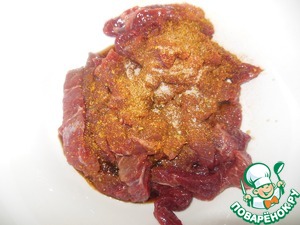 Перекладываем мясо в миску, заливаем маринадом, посыпаем специями, добавляем немного соли, всё хорошо перемешиваем, и оставляем мариноваться на 30 минут, можно и больше. (в моём случае стояло 4 часа)