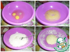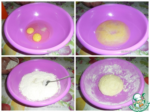 • Делаем тесто. В чашку разбиваем яйца. Добавляем соль, растительное масло. Взбиваем. Добавляем 0,5 стакана воды. Хорошо перемешиваем. Добавляем муку. Замешиваем тесто. Оборачиваем пищевой пленкой, оставляем на 20 минут.