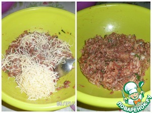 • Сыр трем на терке, делим на 2 части. Одну часть добавляем к мясному фаршу. Перемешиваем.