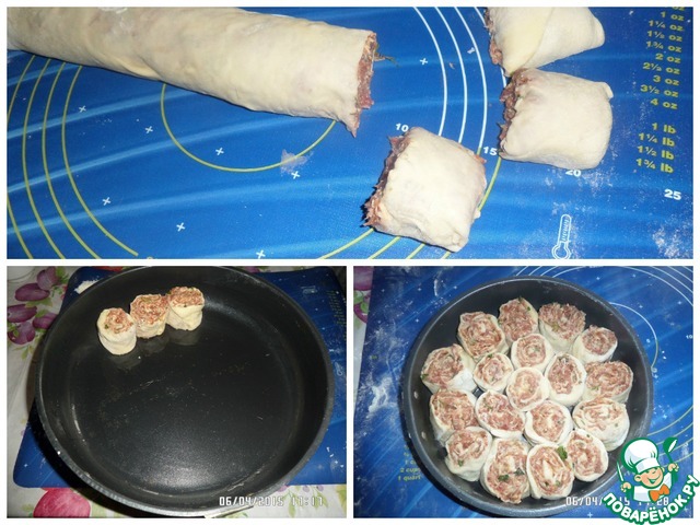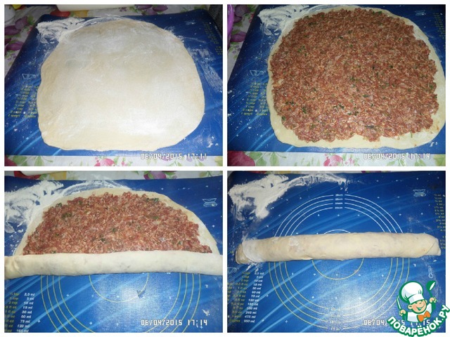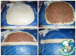 • Тесто раскатываем в тонкую лепешку. Распределяем на ней мясной фарш. Сворачиваем рулетом.