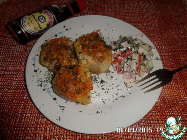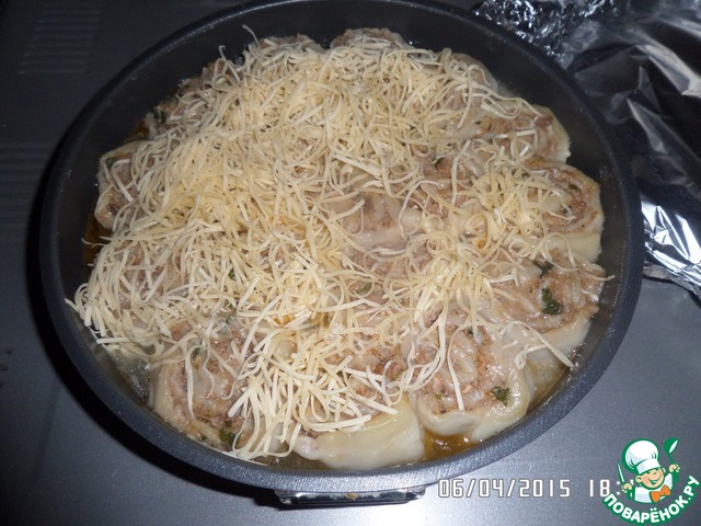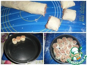• Подготовленный рулет нарезаем на одинаковые кусочки. Выкладываем их на смазанный маслом противень. Добавляем 0,5 стакана воды. Закрываем противень фольгой и ставим в духовку на 45 минут при 150-170 градусах.