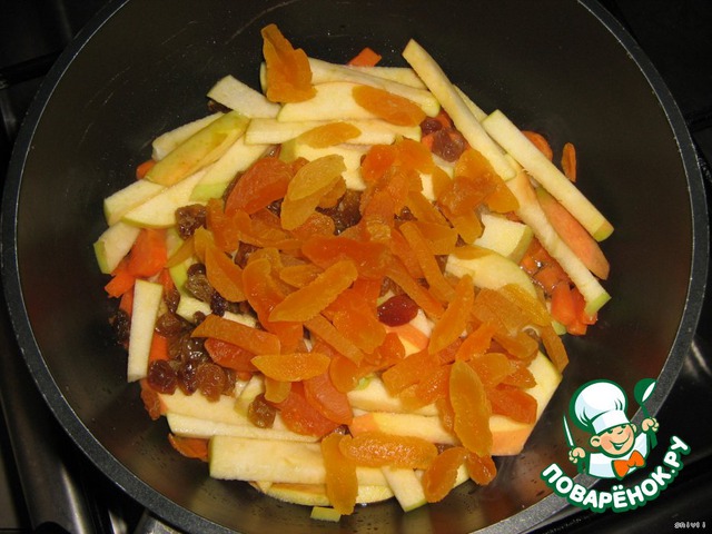 потом добавить яблоки, слегка припустить 2-3 мин. и положить сухофрукты.