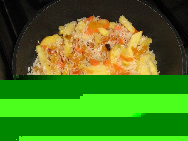 Получился очень ароматный и рассыпчатый плов! Сахар я не кладу, так как и морковь и все фрукты сладкие, и плов получается сладкий сам по себе.