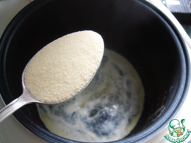Всыпать манку и варить 5 минут, помешивая.