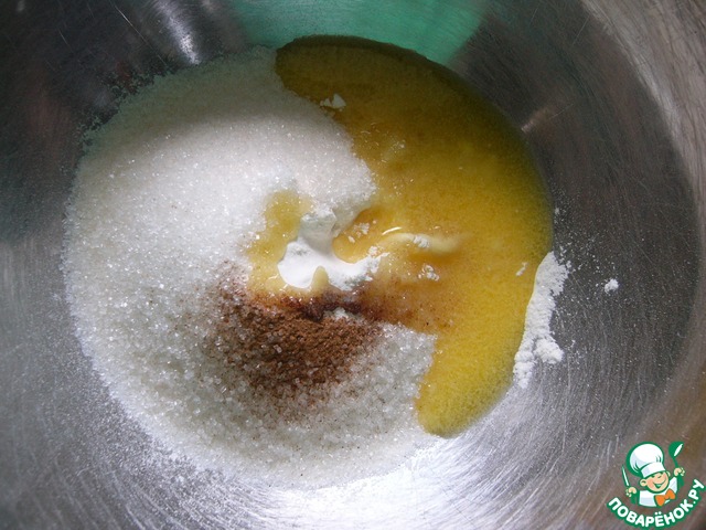 Для посыпки в миску всыпать муку, сахар, корицу, ваниин. Добавить растопленное масло и руками растереть в крошку
