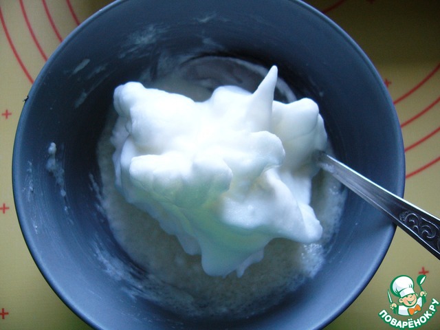 Теперь вернёмся к творожной начинке. Взбить белок в крепкую пену и соединить с подготовленной ранее творожной массой, аккуратно перемешивая обратной стороной ложки (!)