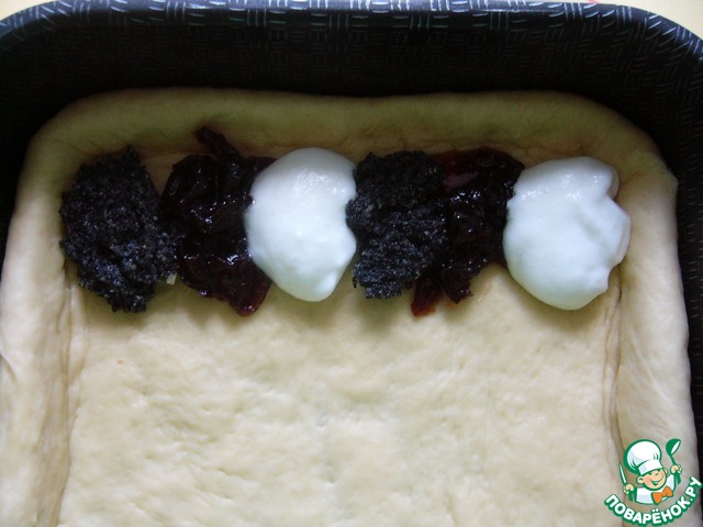 Выкладываем начинки -маковую, яблочную, творожную, маковую, яблочную, творожную и т. д по 1 ч. л. каждой