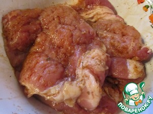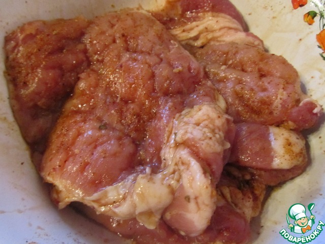 Добавить по вкусу специи и яблочный уксус. Оставить мясо мариноваться на 30 минут.