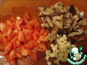 Маринованные грибочки и помидор нарезать мелкими кубиками, чеснок тоже измельчить.
