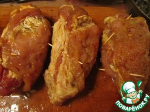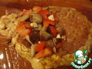 На антрекоты выложить начинку, завернуть мясо рулетиками