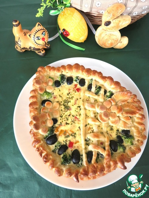 Затем сформировать фигурный кантик из теста, выложить овощи и залить яично-сливочной массой с сыром.