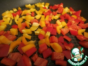 Перец очистить от семян, порезать крупным кубиком и обжарить на оливковом масле.
