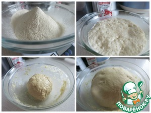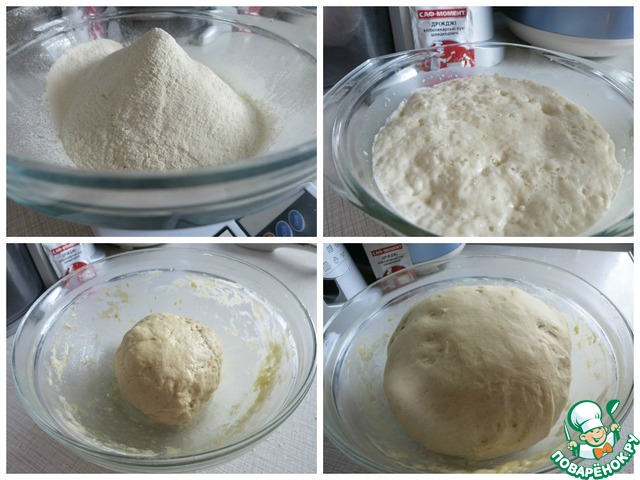 • Муку просеять горкой, добавить соль, сделать углубление, в которое влить опару и оливковое масло. Вымесить гладкое тесто, сформировать в шар. Миску смазать маслом, тесто положить в миску, накрыть полотенечком и поставить в теплое место подойти минут на 30. Обмять тесто и опять поставить подойти еще минут на 20.