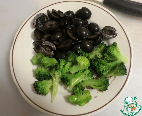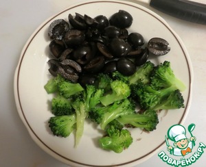 • Маслины без косточек порезать вдоль на половинки, брокколи разобрать на небольшие соцветия.