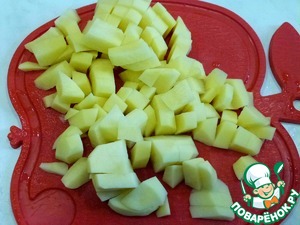 На огонь ставим кастрюлю с водой, я брала кастрюлю на 3л, наполнила водой на половину. Картофель режем кубиками и бросаем в кипящую воду.
