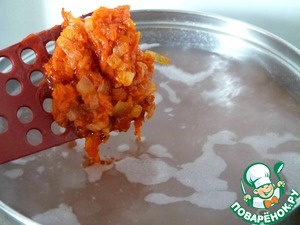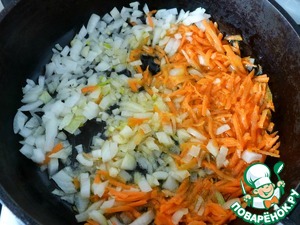 Лук режем кубиками, морковь трем на крупной терке. Обжариваем на растительном масле