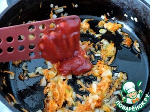 В зажарку добавляем томатную пасту (я брала краснодарский соус), или помидоры.