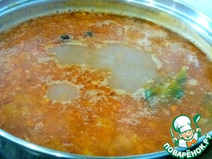 В кипящий суп выкладываем чеснок, солим и добавляем специи по вкусу, я использовала– черный молотый перец, пару перчинок душистого перца горошком, немного кориандра, лавровый лист, молотая красная паприка. Дать прокипеть еще 3-5 минут и выключаем.