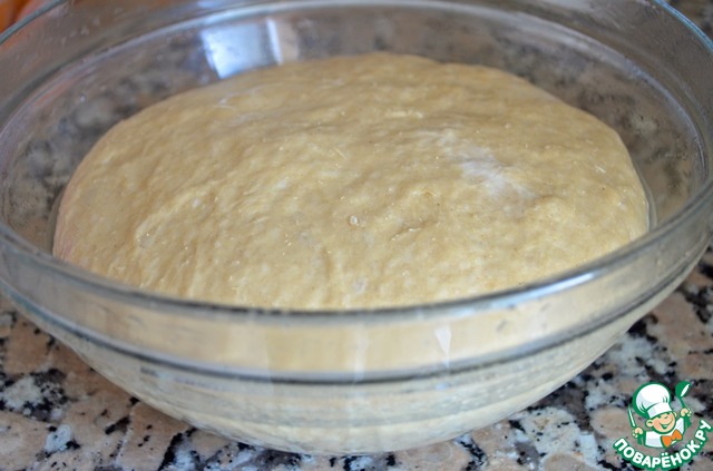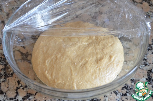 4. Смазать большую чистую миску растительным маслом, положить в нее тесто и накрыть смазанной маслом пищевой пленкой. Маслом пленка мажется для того, чтобы верх теста не сох, и чтобы на нем не сформировалась корочка. Оставить тесто подходить 1 час. Оно должно увеличиться вдвое.
