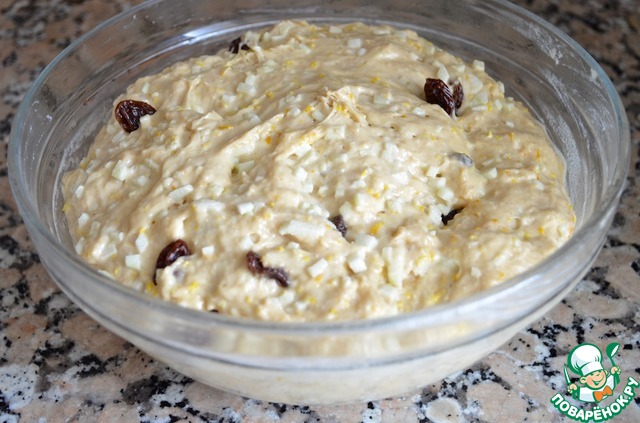 5. Удалить сердцевину яблока, очистить его от кожуры и мелко нарезать. Выложить изюм, яблоко и цедру и вымесить тесто, не доставая его из миски и равномерно распределяя все добавленные ингредиенты. Оставить подходить еще час под смазанной маслом пленкой.