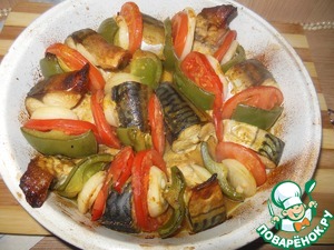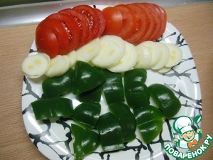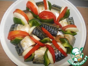 Между каждым кусочком рыбы, выкладываем по кусочку перца, лука и помидора.