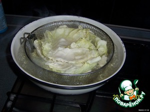 Пока картошка запекается, разберем на листья маленькую капустку и поставим варить. Сразу оговорюсь, варить будем хорошенько, чтобы потом не хрустела на зубах и жесткой не была. Потому что это у нас основная термическая обработка. Я вот приспособила для варки такую вот конструкцию как на фотке (большая миска и сетка для фритюра, которым я ни в жизнь не пользуюсь).