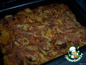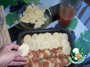 Сначала приготовим пряную томатную заливку. Измельчим в блендере помидоры, лук, чеснок, перец, огурец, зелень, добавим соль и разбавим немного минеральной водой. Картофель почистим и нарежем кружочками не толще 5 мм. На дно формы нальем немного соуса, выложим слой картофеля, потом опять соус, потом картофель и сверху выливаем все что осталось.
