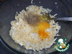 Капуста варится, а мы делаем начинку для шницелей. Сыр трем на терке, добавляем яйцо и перец. Перемешиваем. Сыр у меня я даже не знаю какой, знаю, что содержание жира в нем всего 17%, вроде Ольтермани если не путаю. Я вообще прежде чем купить какой-либо продукт смотрю на содержание жира в нем.