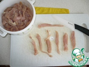 Куриное филе необходимо нарезать тоненькими и длинными полосками.