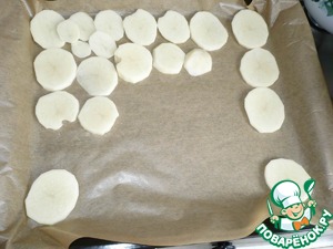 Противень я застилаю пергаментной бумагой. На нее начинаю выкладывать сначала кружочки картофеля.