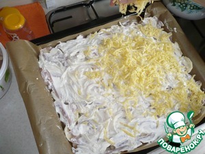 Тёртый сыр я равномерно распределяю по всему объёму противня.