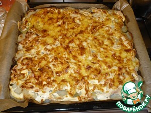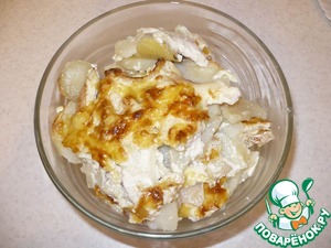 Сметанно-луковую "Заливку" необходимо выложить сверху на куриное филе с картофелем.