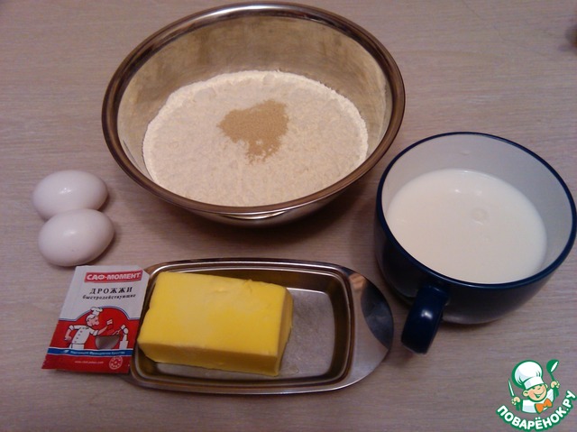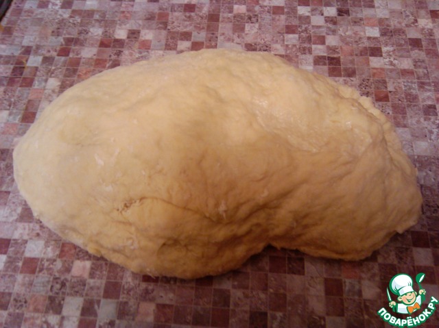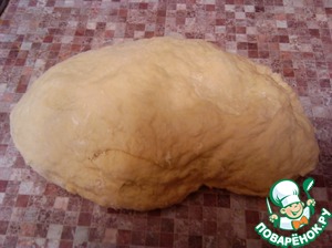 • Теперь в молоке растворяем соль и сахар, добавляем его к муке, туда же добавляем яйца и мягкое масло, замешиваем тесто