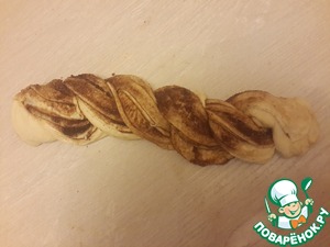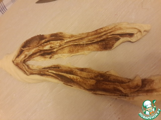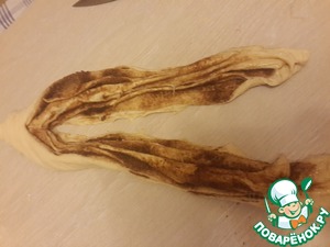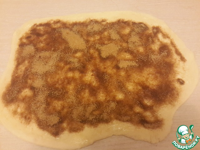 • Теперь раскатываем пласт, смазываем его растительным маслом, посыпаем сахаром с корицей, сворачиваем рулетом