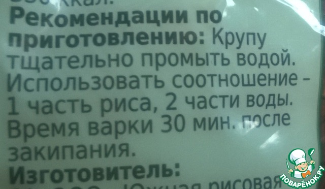 Итак, для начала отварим рис. Он варится дольше обычного. Производитель указал следующие рекомендации (см. фото). У меня же получилась пропорция 1:2,5 (рис:вода) и время варки минут 45 (пока вся вода не исчезнет) на небольшом огне. Иначе у меня он получался недоваренным.