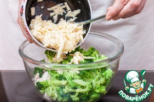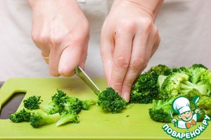 Пока поднимается тесто, приготовим начинку. В кипящей подсоленной воде отварить брокколи в течение 4-5 минут, откинуть на дуршлаг, дать воде стечь, затем разделить на небольшие соцветия. Брокколи должна оставаться немного хрустящей, не переварите ее!