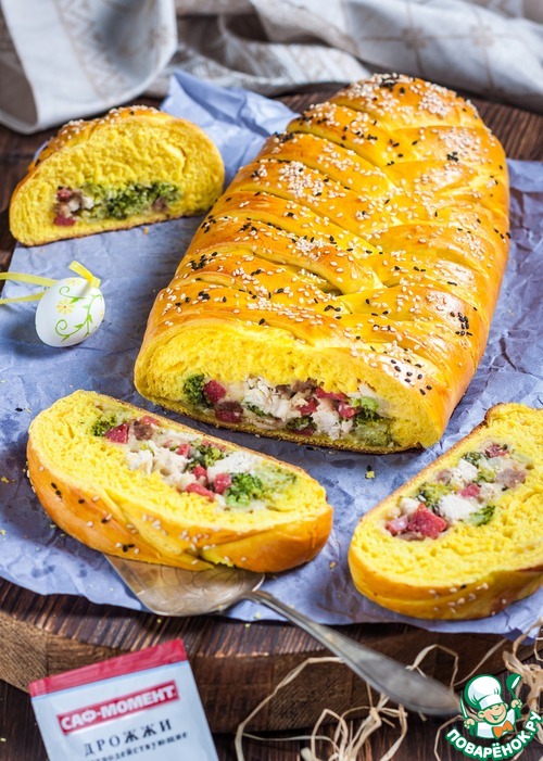 Пирог, который доставит удовольствие не только тем, кто его пробует, но и тому, кто его готовит. Идеально подходит для тех, кто не дружит с дрожжевым тестом. Пирог-бутерброд станет украшением вашего пасхального стола благодаря солнечному цвету теста и яркой начинке. Хорош и для уютных домашних посиделок, и для гостей, и для вылазок на природу. П. С. Следуя подробной инструкции, данной в рецепте, с пирогом справится даже неопытная хозяйка!