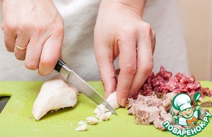 Нарежем мелким кубиком отварную или запеченную куриную грудку и ветчину. Ветчины у меня было мало, поэтому я добавила немного сырокопченой колбасы.