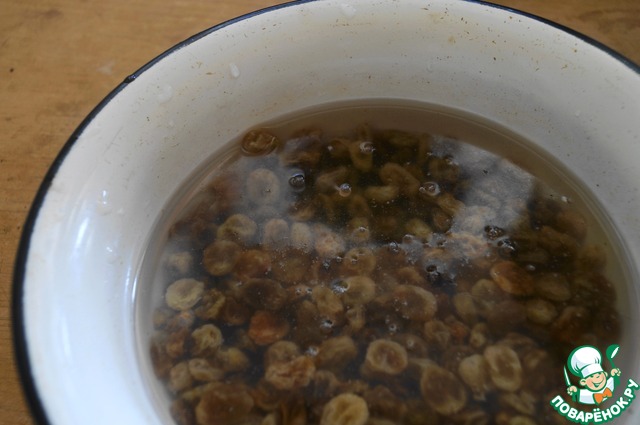 • Пока подходит тесто, приготовим начинку. Изюм залить кипятком и дать постоять минут 15. Затем промыть его прохладной водой. Слить воду.