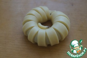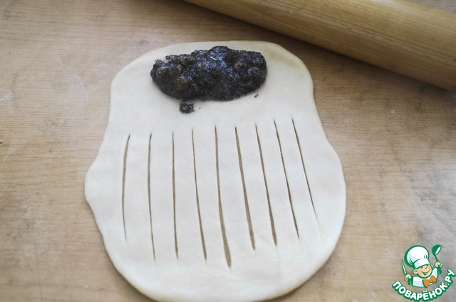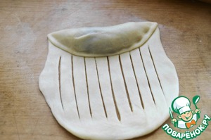 • Отделяем небольшой кусочек теста и раскатываем его, на край кладем немного начинки, делаем надрезы но не до конца.