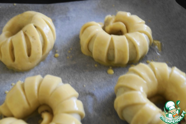 • Таким образом поступаем со всем тестом, выкладываем заготовки на противень застеленный бумагой для выпечки и смазываем взбитым желтком со сливками. Выпекаем в разогретой до 200 градусов духовке около 20 минут, до золотистой корочки. Подаем к чаю или дарим близким. Приятного аппетита!