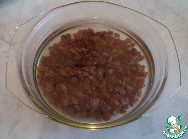 Пока тесто подходит, подготовить изюм: хорошо промыть, залить кипятком на 10 минут. Затем слить воду и хорошо просушить ягоды.