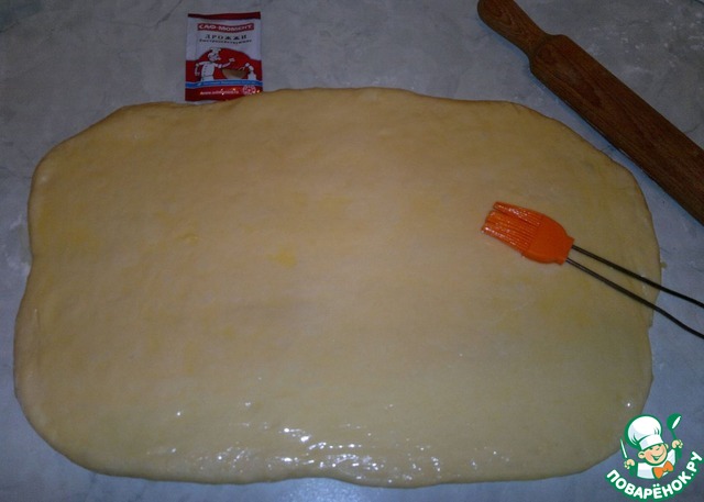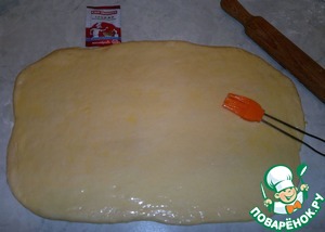 Подошедшее тесто раскатать в пласт толщиной около 0,5 см, смазать растопленным сливочным маслом (30 г).
