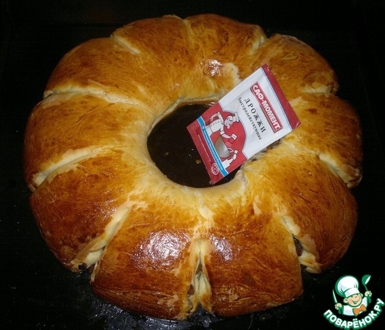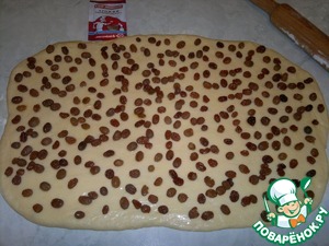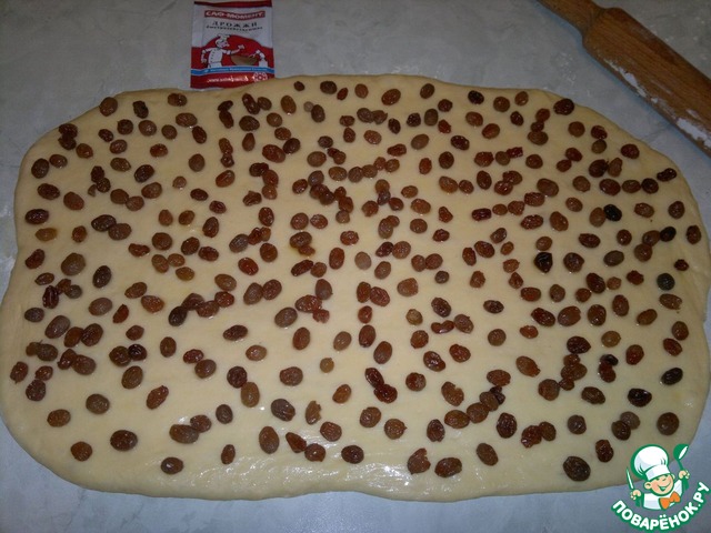 По поверхности теста равномерно выложить изюм, свернуть рулет, края защипнуть в кольцо. Начинку можно использовать любую, по своему вкусу.
