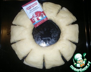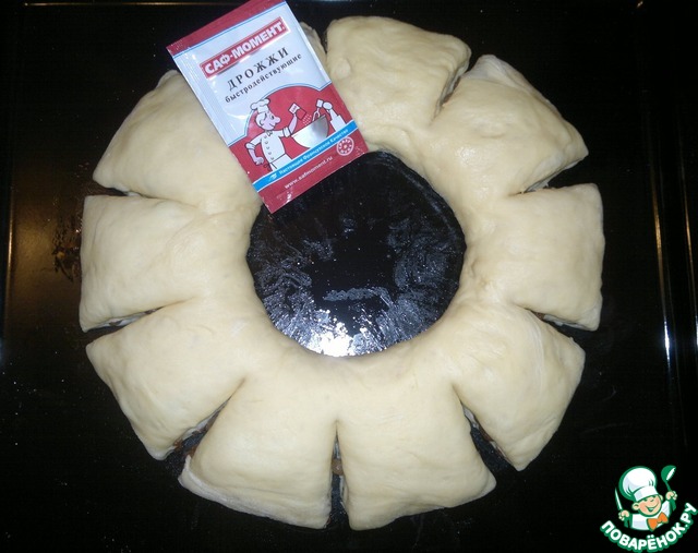 Осторожно переложить веночек на смазанный противень, с помощью ножа сделать надрезы по всей окружности кольца. Дать подняться.