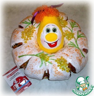 Я для украшения отделила немного глазури, добавила зеленый пищевой краситель, нарисовала веточки мимозы. Цветочки сделала из мармелада.